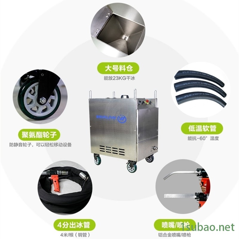 公司干冰清洗机和干冰产品规格齐全,资质完善,供货稳定,质优价廉。干冰是食品级其纯度可达99.9以上,适用于餐饮、婚庆、医药、冷链、电商等。干冰清洗机主要有WUAI-MINI型、WUAI-CC6型、WUAI-35QX型、WUAI-65QX等多种干冰清洗机型,广泛适用于干冰清洗橡胶模具、发动机表面积碳残留、树脂油污、玩具手机外壳等表面毛刺残留。帮助很大工厂、企业解决了污渍清洗困难的难题。